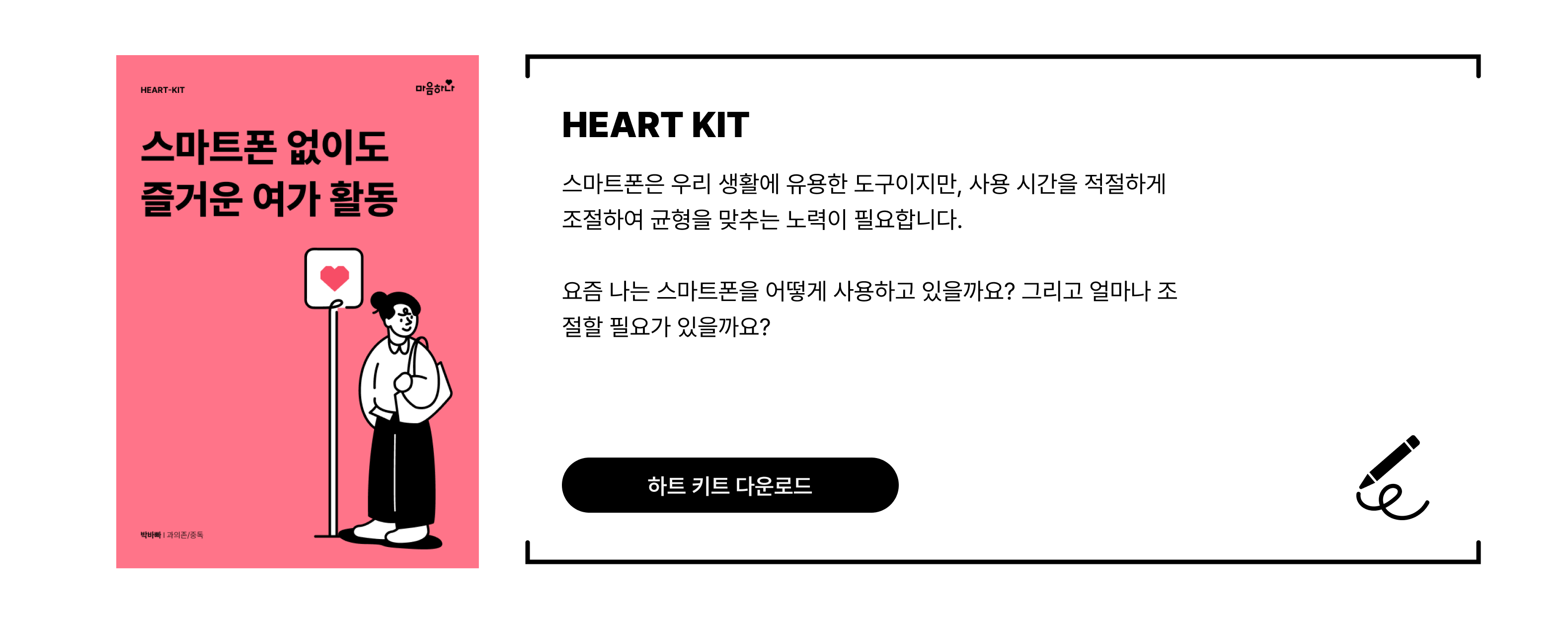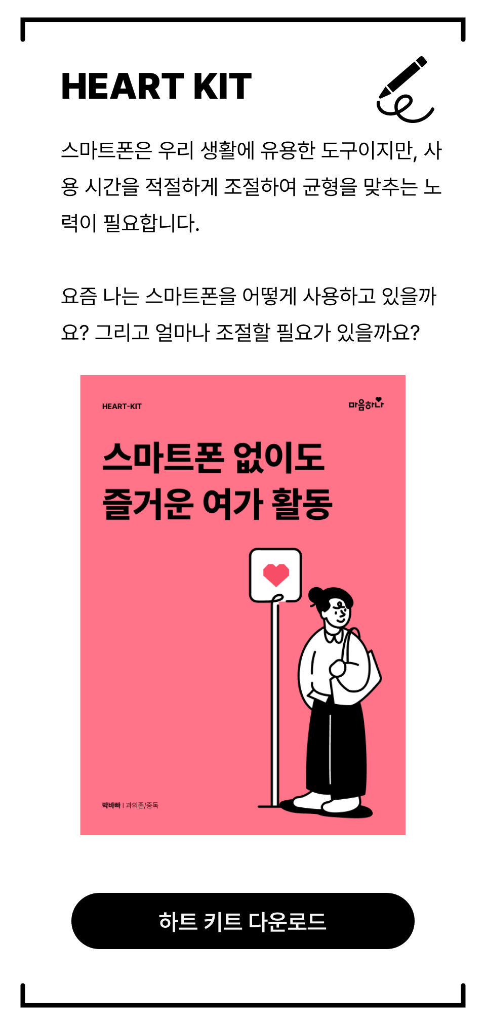 스마트폰 과의존을 줄이기 위해서 혼자서도 쉽게 해볼 수 있는 '하트키트(HEART-KIT)'를 아래에 준비했어요. 꼭 다운로드 받아서 해보기를 바랄게요!