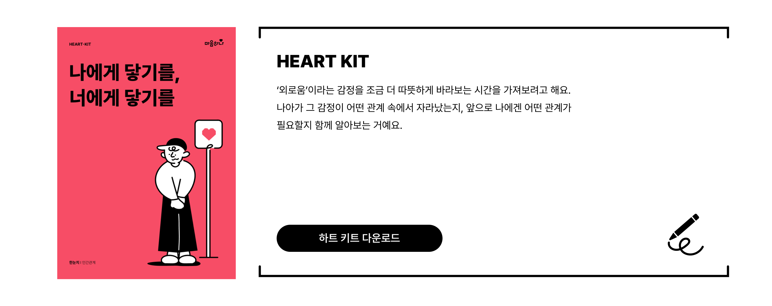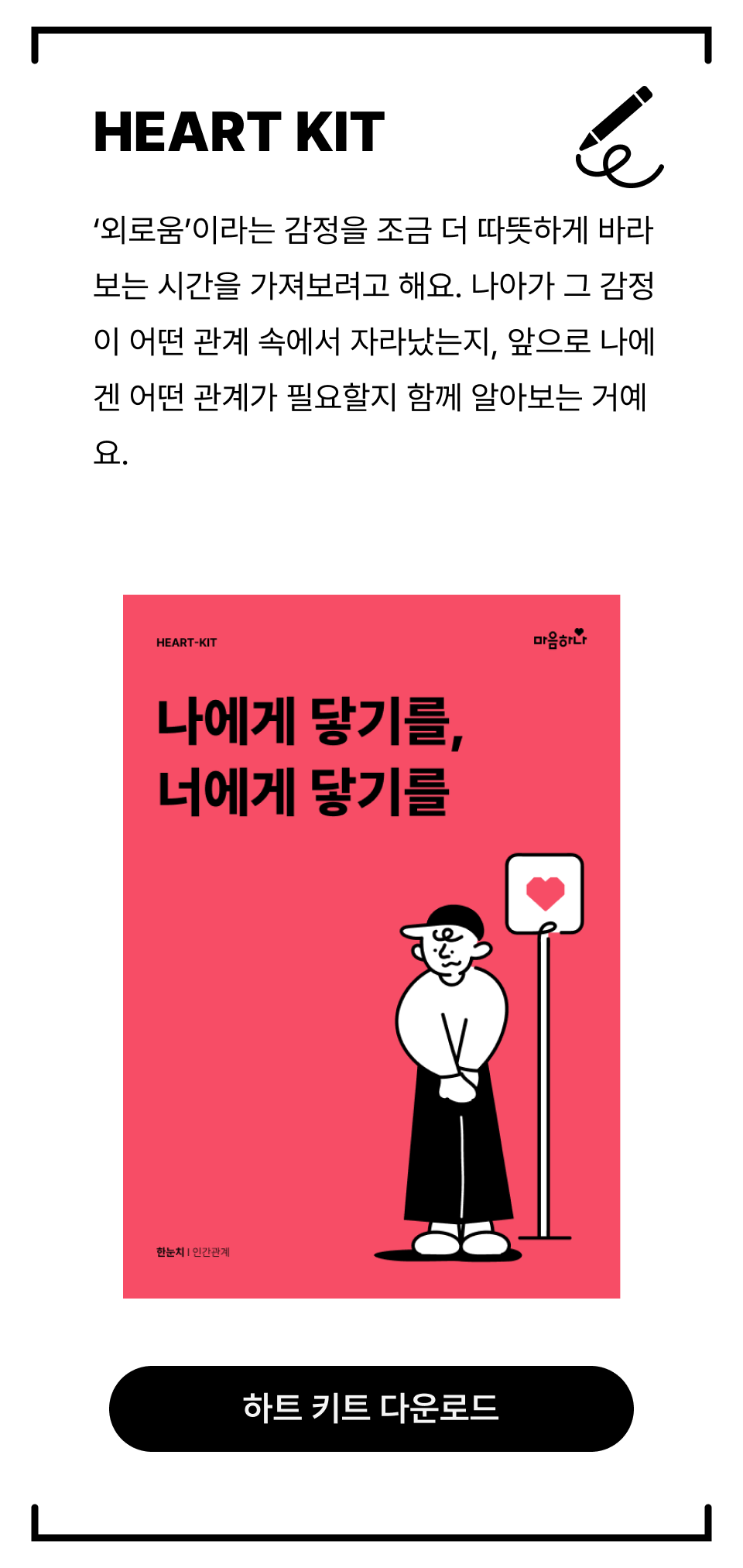 나아가, ‘나와의 연결’이 ‘타인과의 연결’로 확장될 수 있도록 ‘하트키트(HEART-KIT)’를 준비했어요. 꼭 다운로드 받아서 함께하길 바랄게요! |