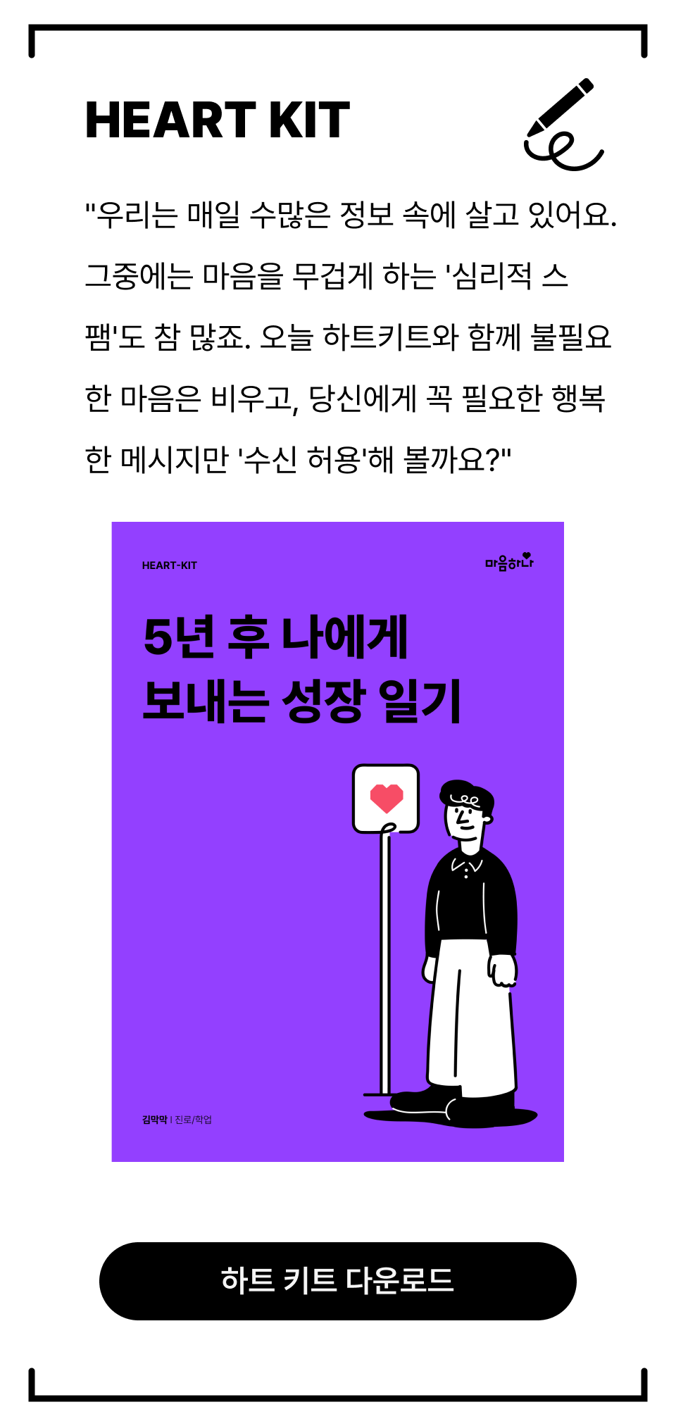 사회의 기준과 타인의 시선을 신경 쓰는 것은 결코 나쁜 일이 아닙니다. 우리는 모두 연결되어 살아가는 사회적 존재니까요. 다만, 그 기준들이 나의 마음을 너무 무겁게 짓누르고 있다면 잠시 내려놓아도 괜찮아요. ‘자기 결정성’은 마치 근육과 같아서 자주 연습할수록 단단해집니다. 처음에는 ‘정말 이렇게 내가 결정해도 괜찮을까?’ 싶어 망설여지겠지만,  아주 작은 일부터 스스로 결정하고 그 결과를 책임지는 연습을 반복해 보세요. 분명 그 경험들이 쌓여 나를 지키는 단단한 근육이 될 거예요.오늘 편지에서 배운 내용을 혼자서도 차근차근 연습할 수 있도록 ‘하트키트(HEART-KIT)’를 준비했어요.  키트를 채워가며 나만의 속도를 찾는 여정을 시작해 보길 응원할게요!